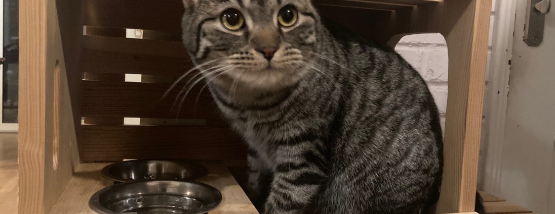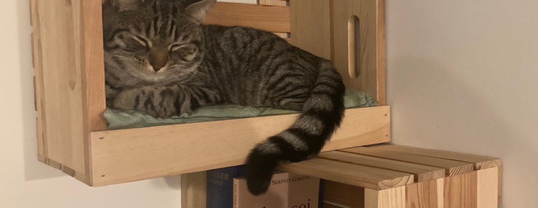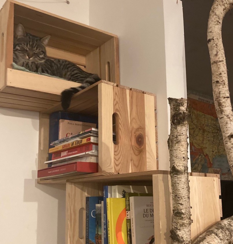 Chacun son petit espace... Le modèle Type 1 de La caisse parisienne permet à Peps de faire la sieste en haut de la bibliothèque "Arbre à chat".